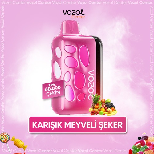 Vozol Rave 40000 Candy aroması; karışık meyve tatları ve dengeli buhar deneyimi sunar. Hızlı şarj ve ayarlanabilir hava akışıyla günlük kullanıma uygundur.
