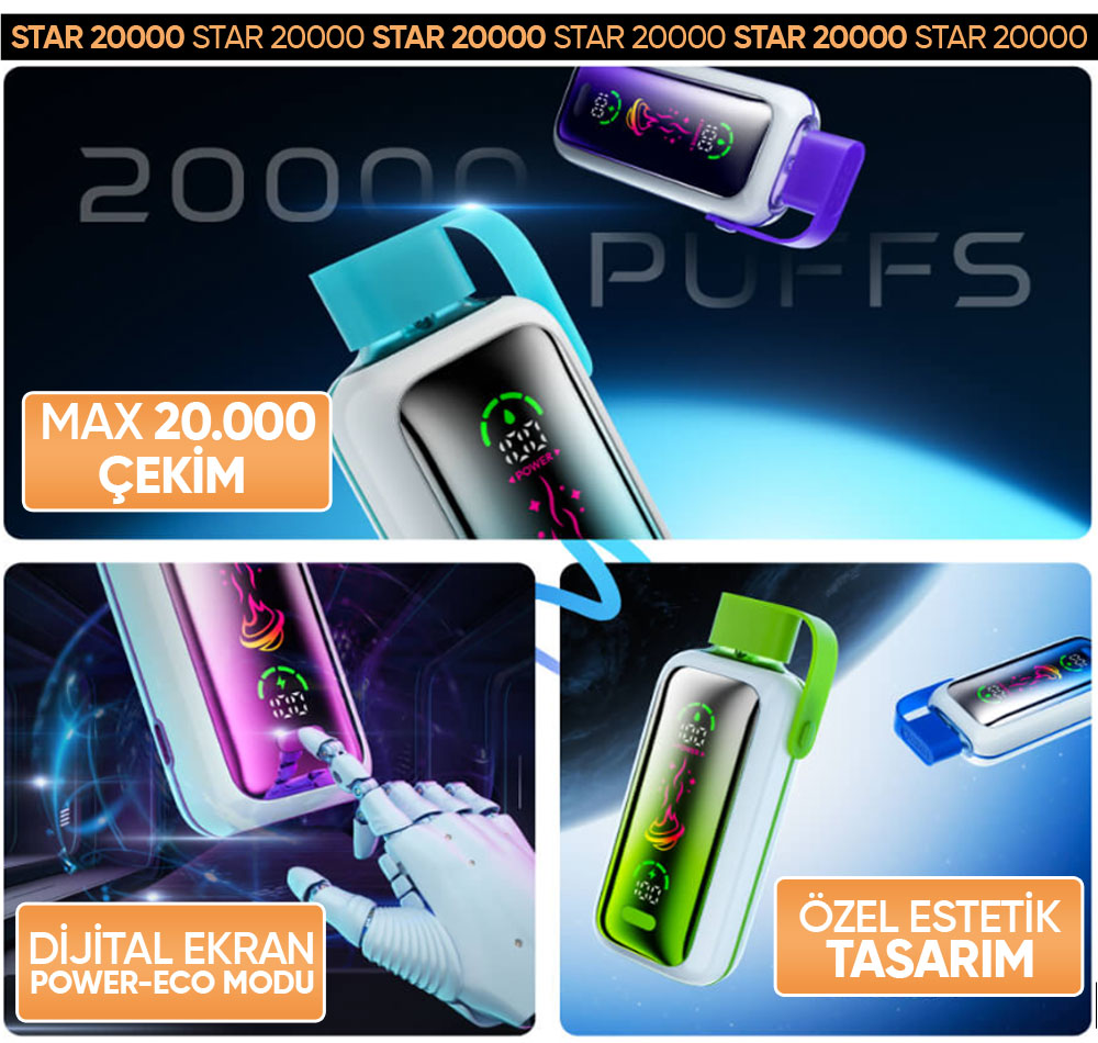 Vozol Star 20000 Chery Cola 20 bin çekimdir. Ürünü eco modda kullanırsanız uzun süreli kullanım sağlarsınız. Power modunda ise biraz daha kısa fakat bu sefer de buhar gücünü artırmış olursunuz. Çekim hızı arttıkça likit seviyesi daha hızlı azalır. Fakat ürünün ortalama kullanım süresi her daim 1 aydır.